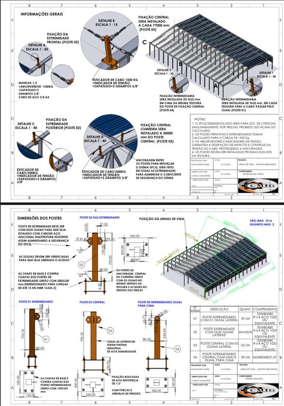 - Componentes de Alta Performance: Utilização de cabo de aço 5/16″ com ruptura de 3.755 Kgf , postes de ancoragem em aço ASTM A36 e absorvedor de energia para limitar a força de impacto.