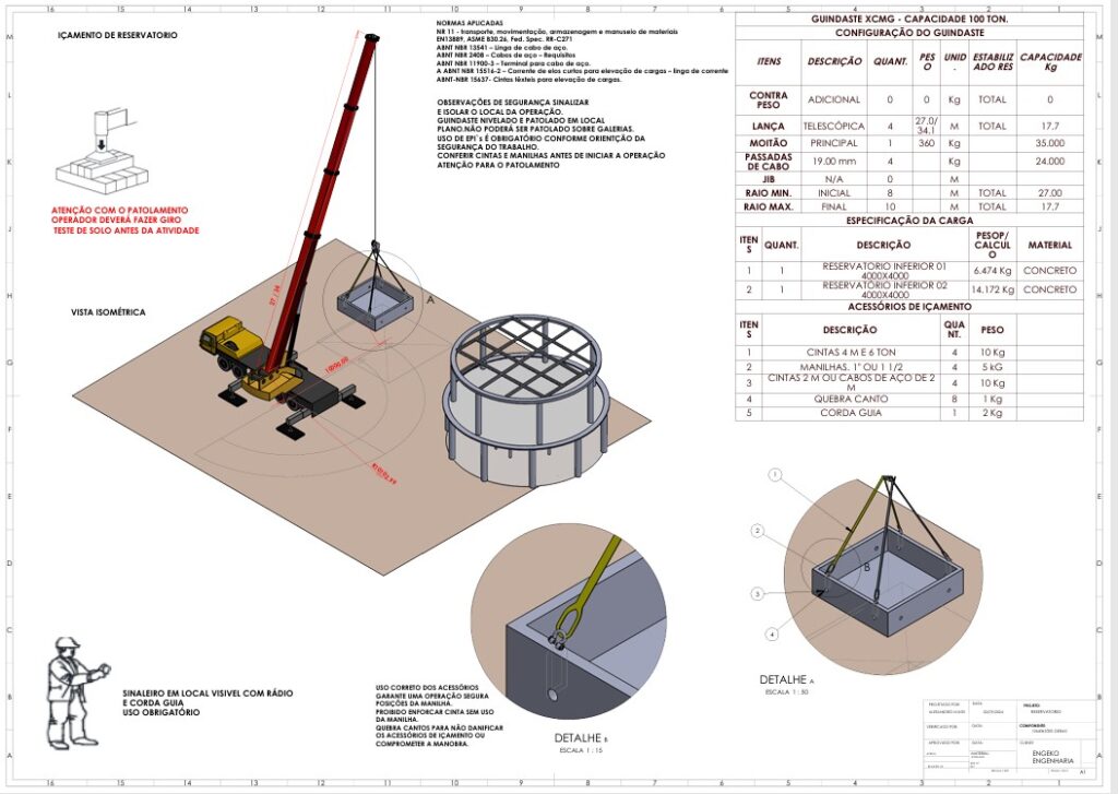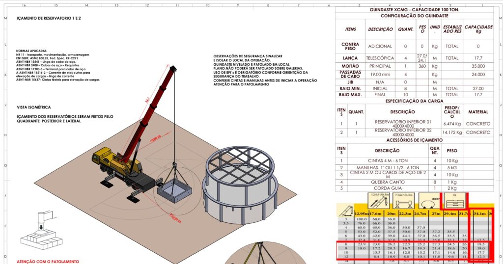 Desafio: A Complexidade da Carga e do Ambiente O içamento dos reservatórios de concreto, com pesos consideráveis de 6.474 kg e 14.172 kg, representou um desafio de engenharia que demandava mais do que apenas um guindaste potente. O desafio era mitigar riscos em um ambiente com restrições de patolamento, garantindo que a manobra ocorresse sem falhas, danos ou atrasos.